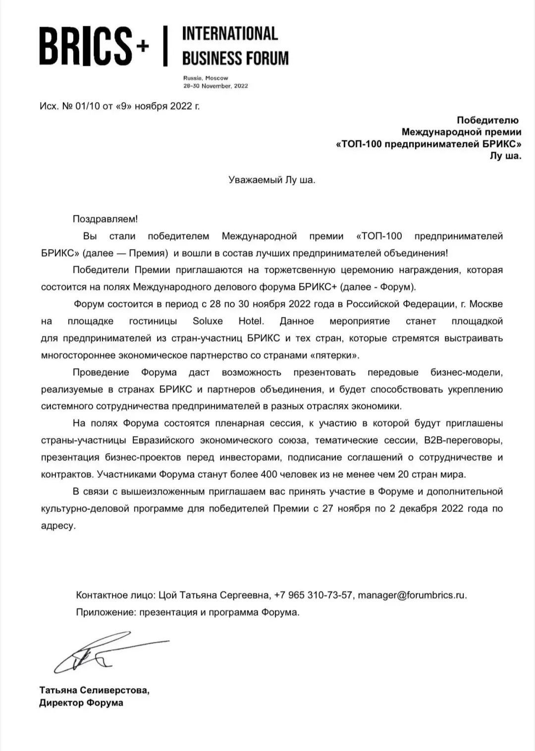 2022年11月29日,“金砖国家百名杰出企业家奖”的颁奖仪式在俄罗斯莫斯科的索洛克斯酒店隆重举行。